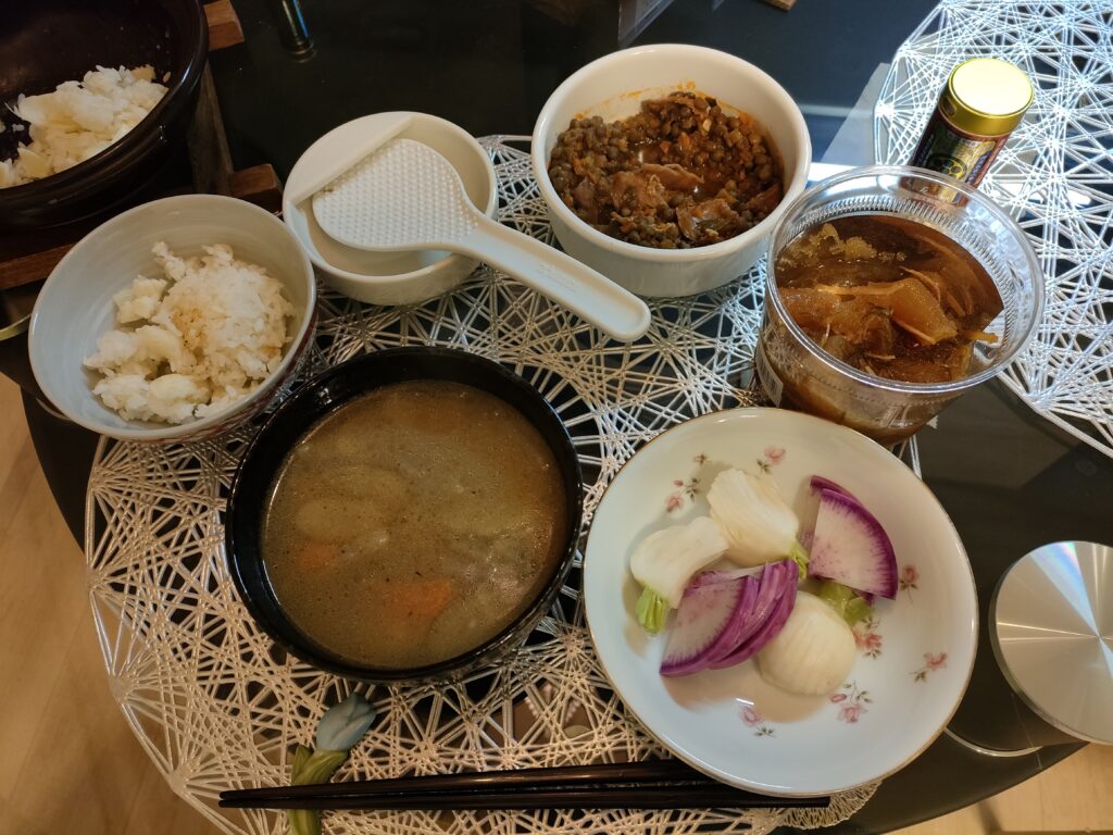 前日、つまり元日に、ゆり根ごはんを炊いてけんちん汁を作ったの。その冷やご飯と、さすがに汁は熱々にあっためたが。