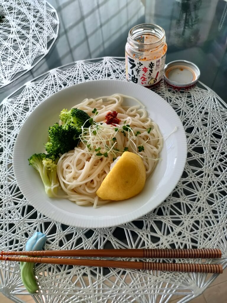 うどんじゃ炭水化物しか摂れないという罪悪感がある。でも、煎餅と柿ピーだって同じ。うどんの汁を味噌汁にすれば罪悪感が無くなると思ったが、暑くなってきたので急遽冷やしうどん。白だしをちょこっと混ぜただけ。色が寂しかったので食べるラー油を乗せたら、味もグッド。