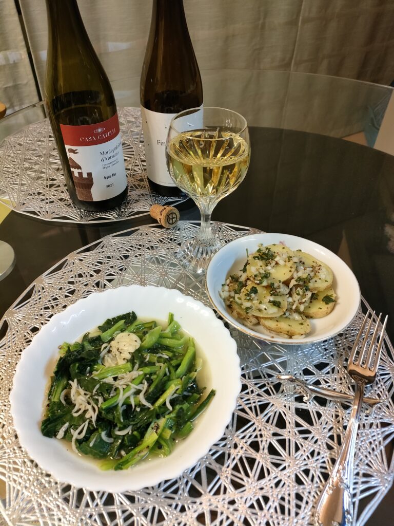 これが、なぜか「赤ワインに合う」とサントリーさんは言うのよ。そうかねえ。小松菜しらすは白ワインだと思うけど、せっかくなので赤ワインもいただいたわ。