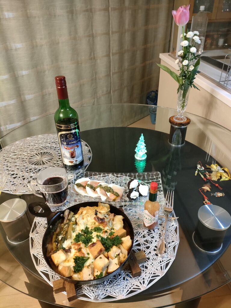 右端の黒い塊はプルーン。クリームチーズを詰めてみた。飲み物は、甘~いグリューワインをヤカンで直接熱して。