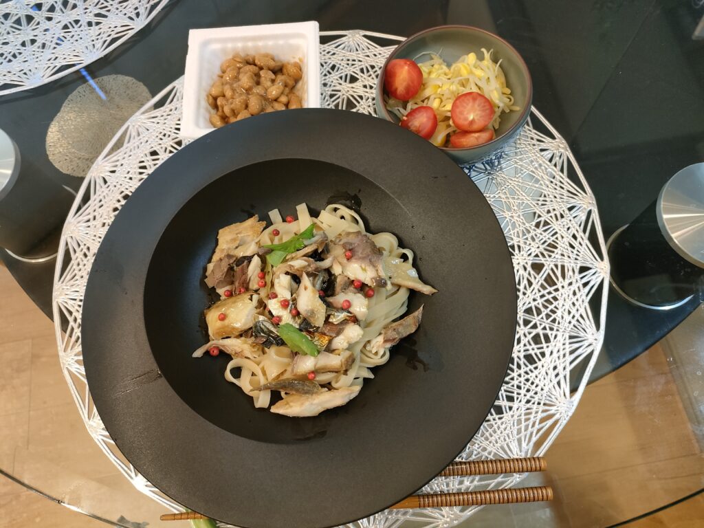 冷凍納豆は昼間から出しておいたし、前日焼いたサバは昼間のうちにほぐしてにんにくとオリーブ油とローリエに浸けておいた。