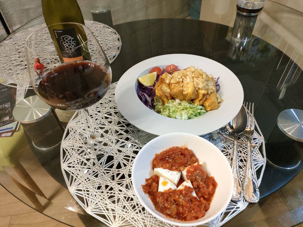奥の皿は、チキン南蛮を厚揚げでアレンジ。片栗まぶして溶き卵絡めて、揚げ焼きしたの。一人分だから、卵焼き器使って。同じ卵焼き器で、余った油で玉ねぎ炒めてトマトソースも作ったよ。