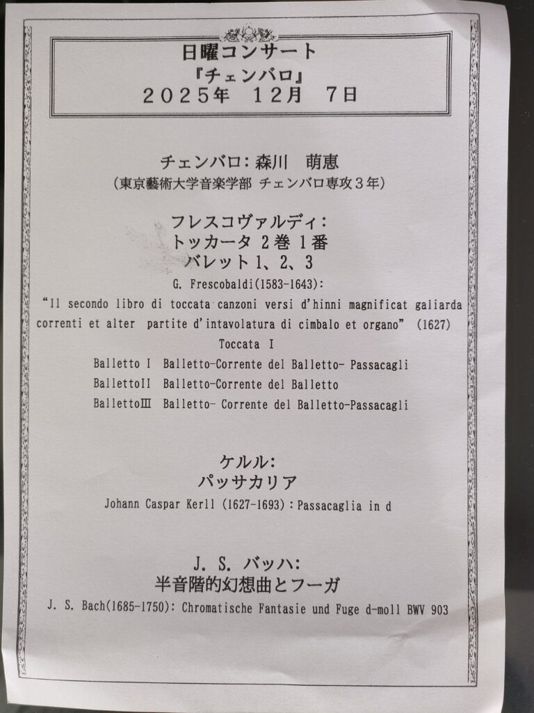きのうは、久しぶりに奏楽堂のチェンバロを聴きに行ったよ。