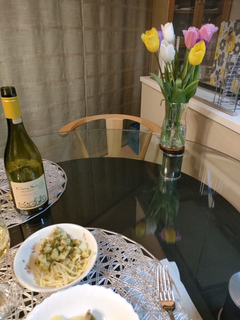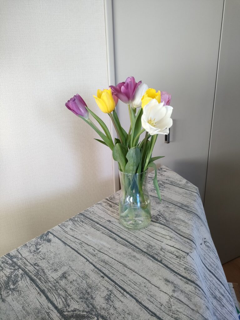 金曜朝に買ったチューリップが、土曜にこんなに開いちゃった。でもきのう日曜、少し復活してくれてホッとした。