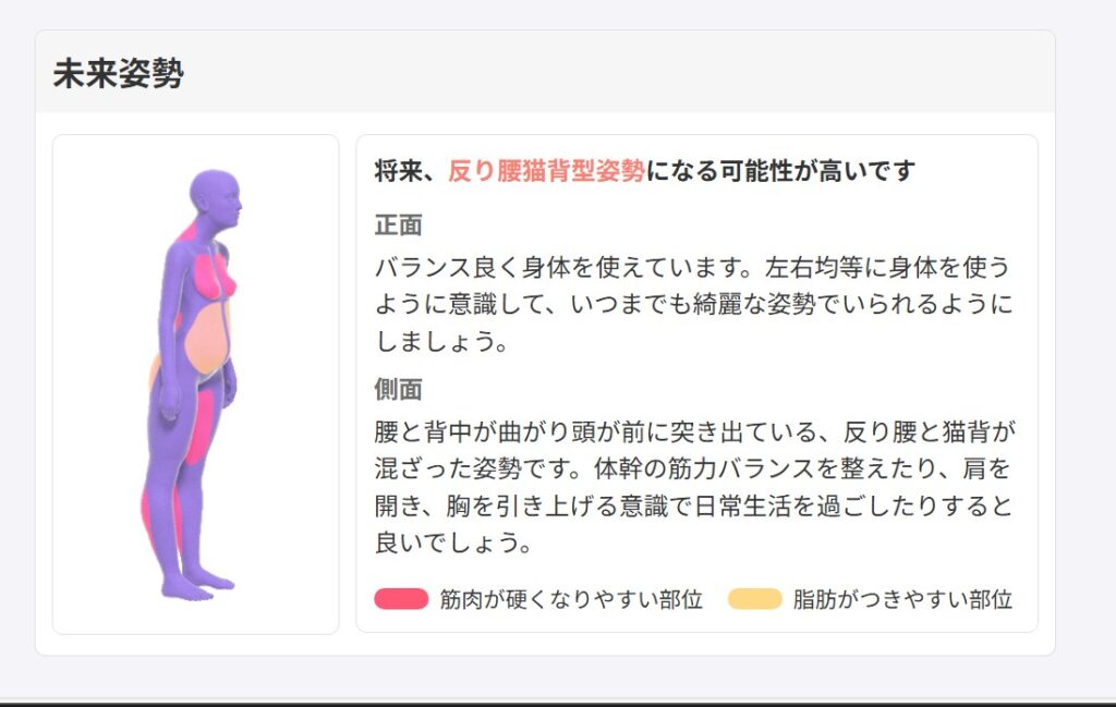 からだのゆがみは、正面・側面・立位体前屈の3枚の写真を撮って、「このままだと将来どんな体型になるか」という動画を合成してくれるの。