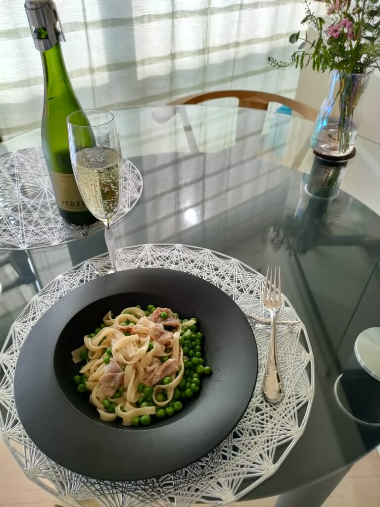 茹で汁で温めたボウルに、生ハムとおろしたパルミジャーノ、バターとオリーブ油と黒こしょうを混ぜて。冷凍のグリンピースを麺といっしょに塩ゆでして、和える。