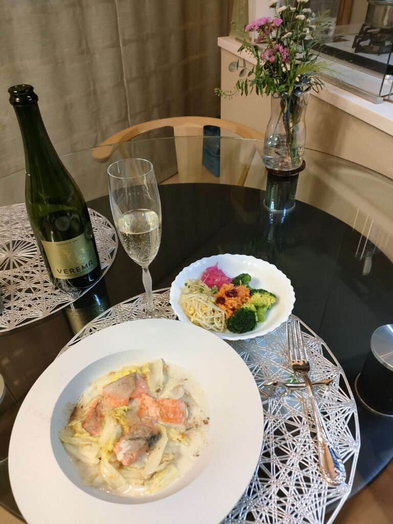 夕飯は、鮭と白菜のクリーム煮。サントリーさんのレシピだよ。