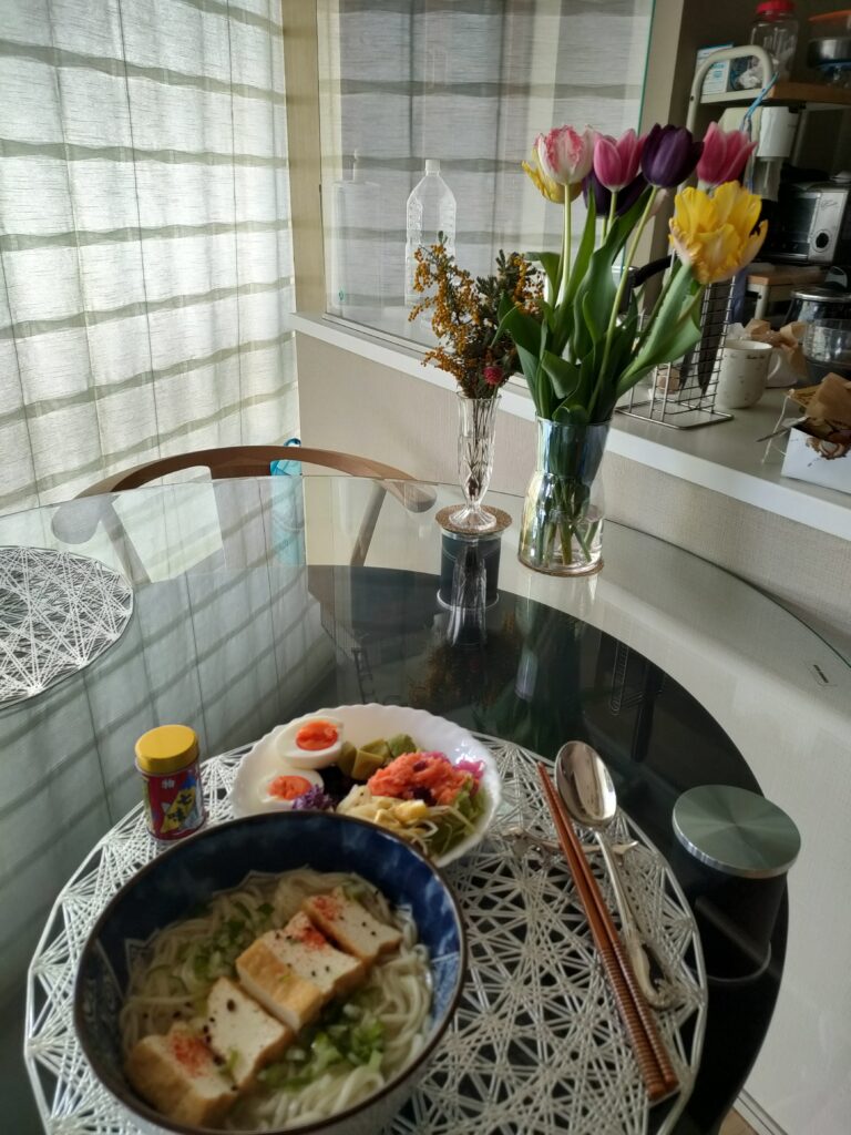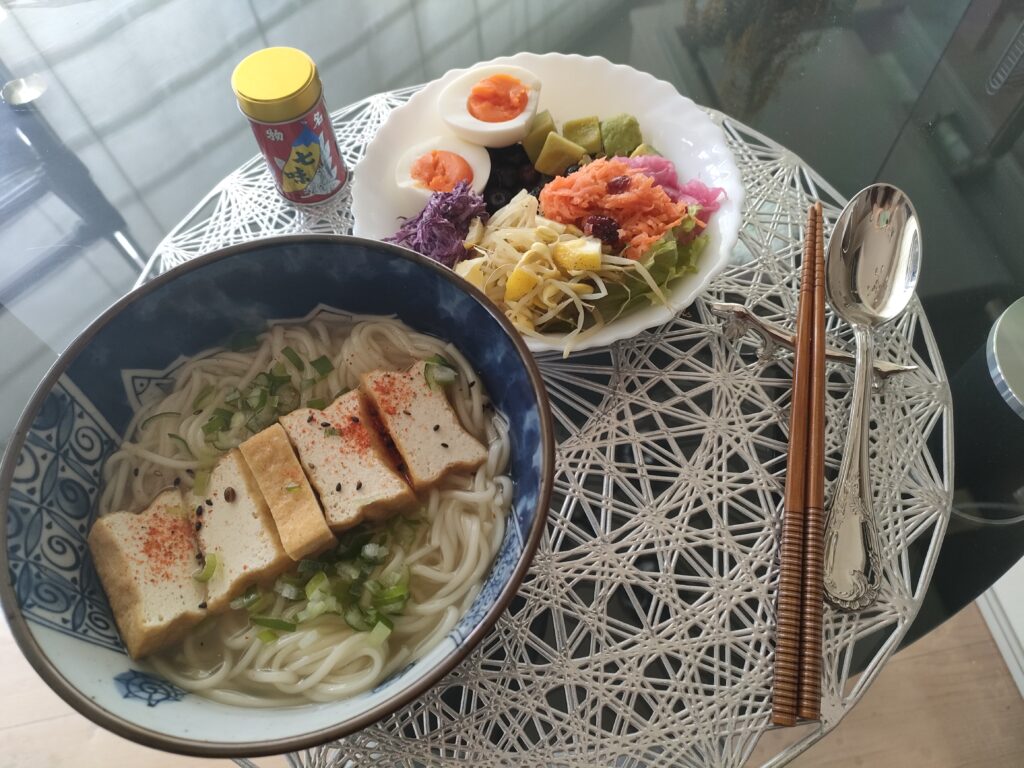 前日に引き続きの細うどんに、厚揚げと冷凍ネギを置いただけ。