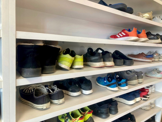一間(いっけん)ぐらいの幅しかない、縦長の靴箱に80人分の靴がぎっしり並ぶ。
