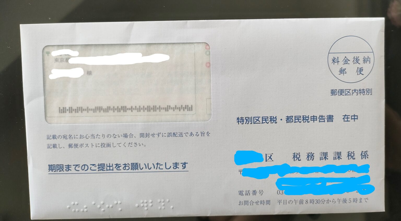 前日、あんなに苦労してスマホから送った、住民税申告書在中だって。