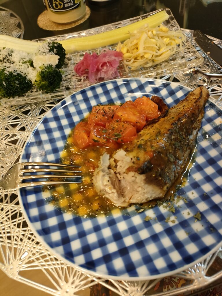 前日の、かつおのたたきが半分残っていたので。ほんとは白身魚で作るレシピでやってみたよ。