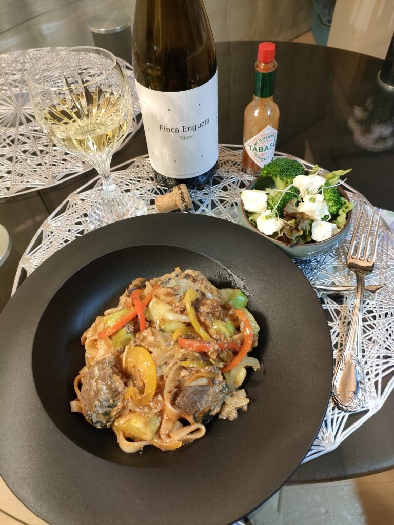せっかくパプリカの赤と黄があるので活かしたものを探し。「サバ缶とたっぷり野菜のナポリタン」を作ってみたよ。