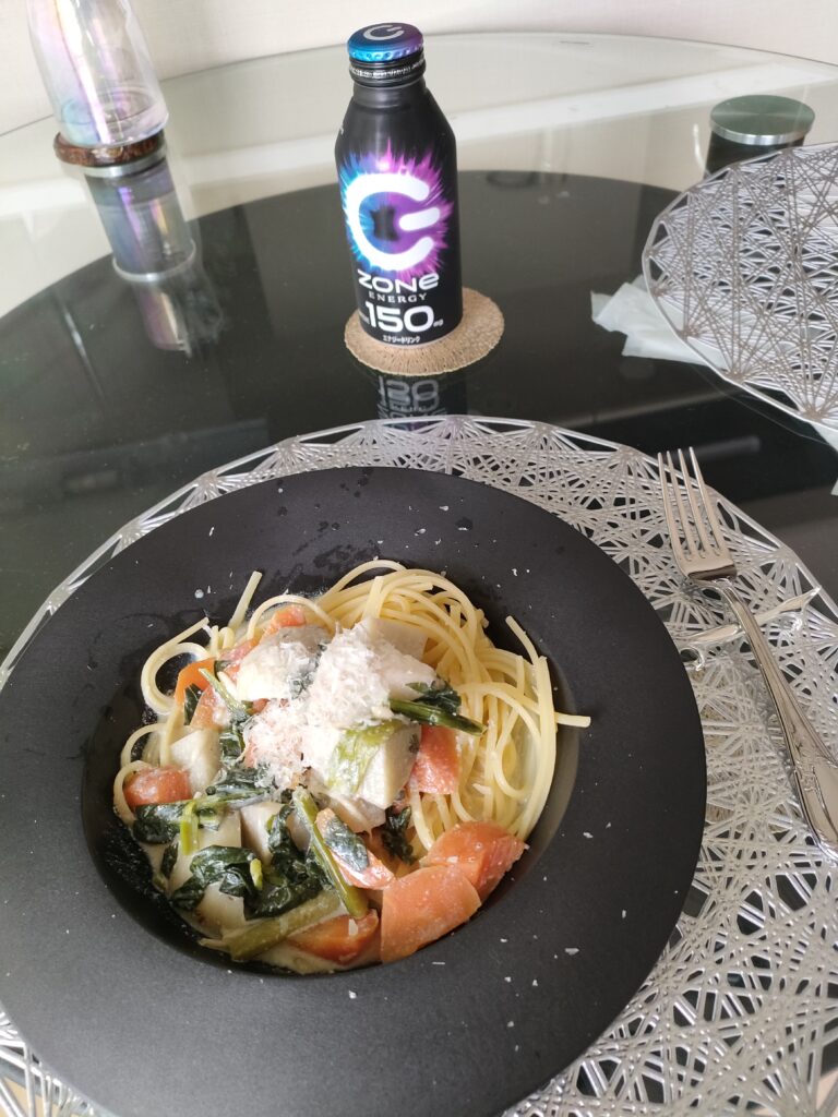 前日の豆乳スープの残をパスタに掛けて、超簡単な昼食。この日のために買って置いたエナジードリンクは1/3ぐらい飲んだ。