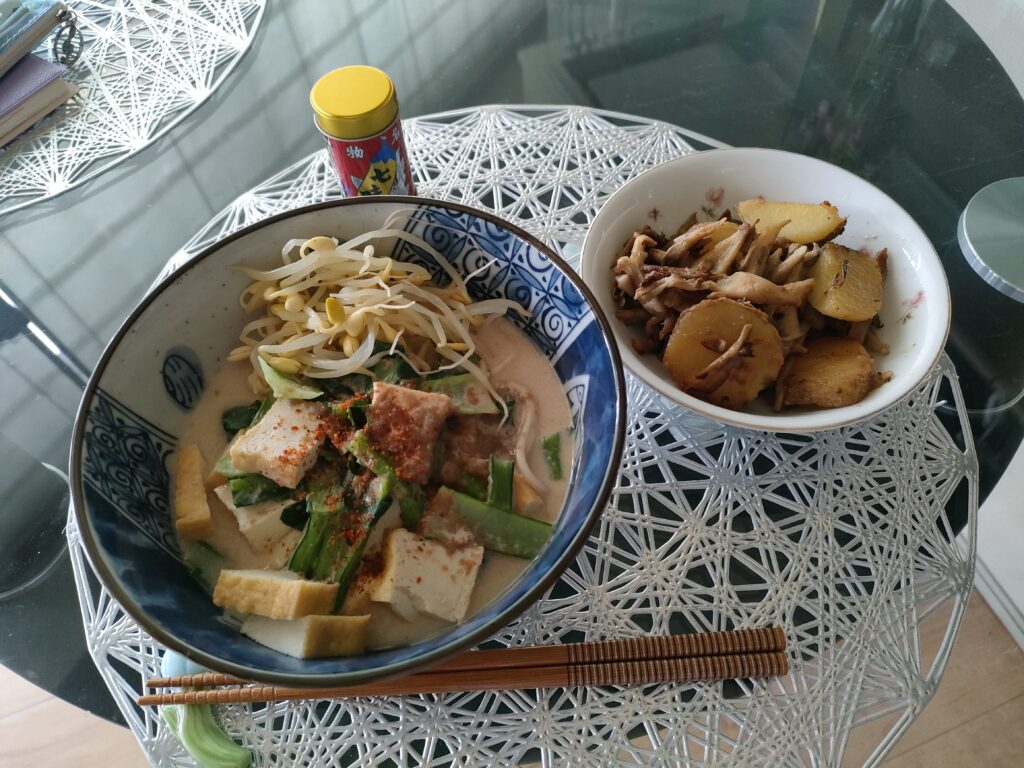 練りゴマと豆乳と醤油を混ぜて、茹でた野菜と麺にぶっかける。ちなみにこれ、ベジタリアンさんのレシピ