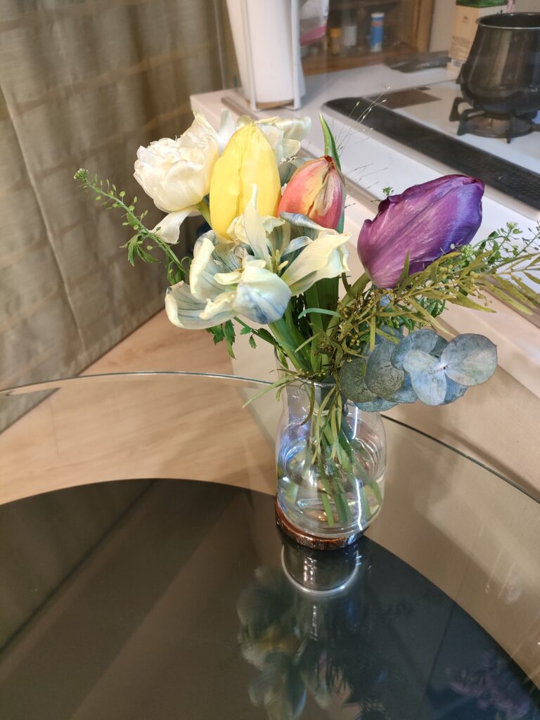 ミドリ色の変わったチューリップさんが「限界です」と言ってる。来週同じ花屋でチューリップ祭りがあるそうだ。それまで、他のチューリップさんには頑張ってもらおう。