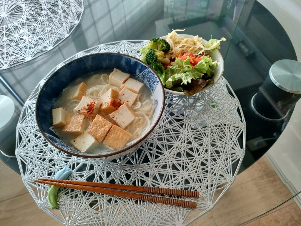 実は前日に焼きうどんを作ったとき、珍しく鶏モモや白菜もいっしょに茹でたのね。そういうレシピだったから。
