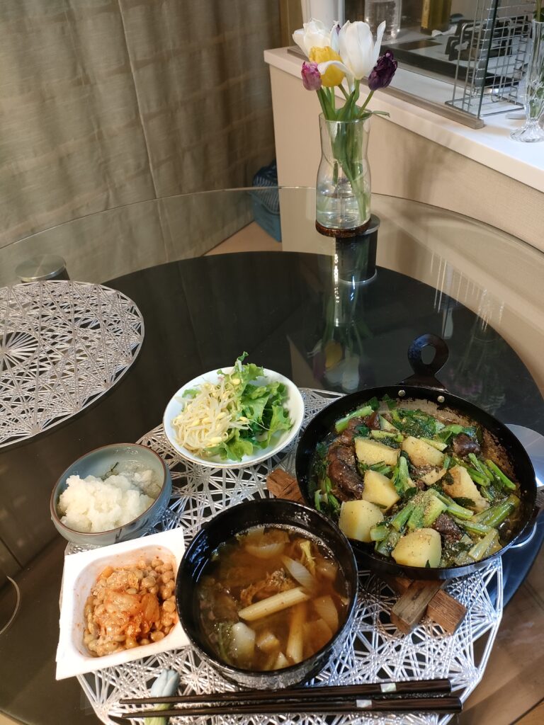硬めに茹でたじゃがいもがある。スーパーで鶏レバー焼きを買って来て、小松菜と炒めた。味付けは昆布茶。