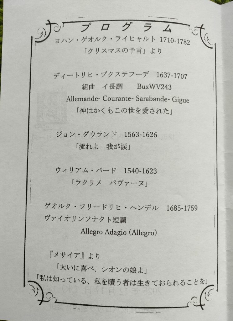 あたしが、もう何ヶ月習っているだろうスウェーリンクの「涙のパヴァーヌ」のために、その原曲であるダウランドの歌曲「流れよ、我が涙」と、それを元にしたチェンバロ曲バード作曲「ラクリメパヴァーヌ」をプログラムに入れてくださった。