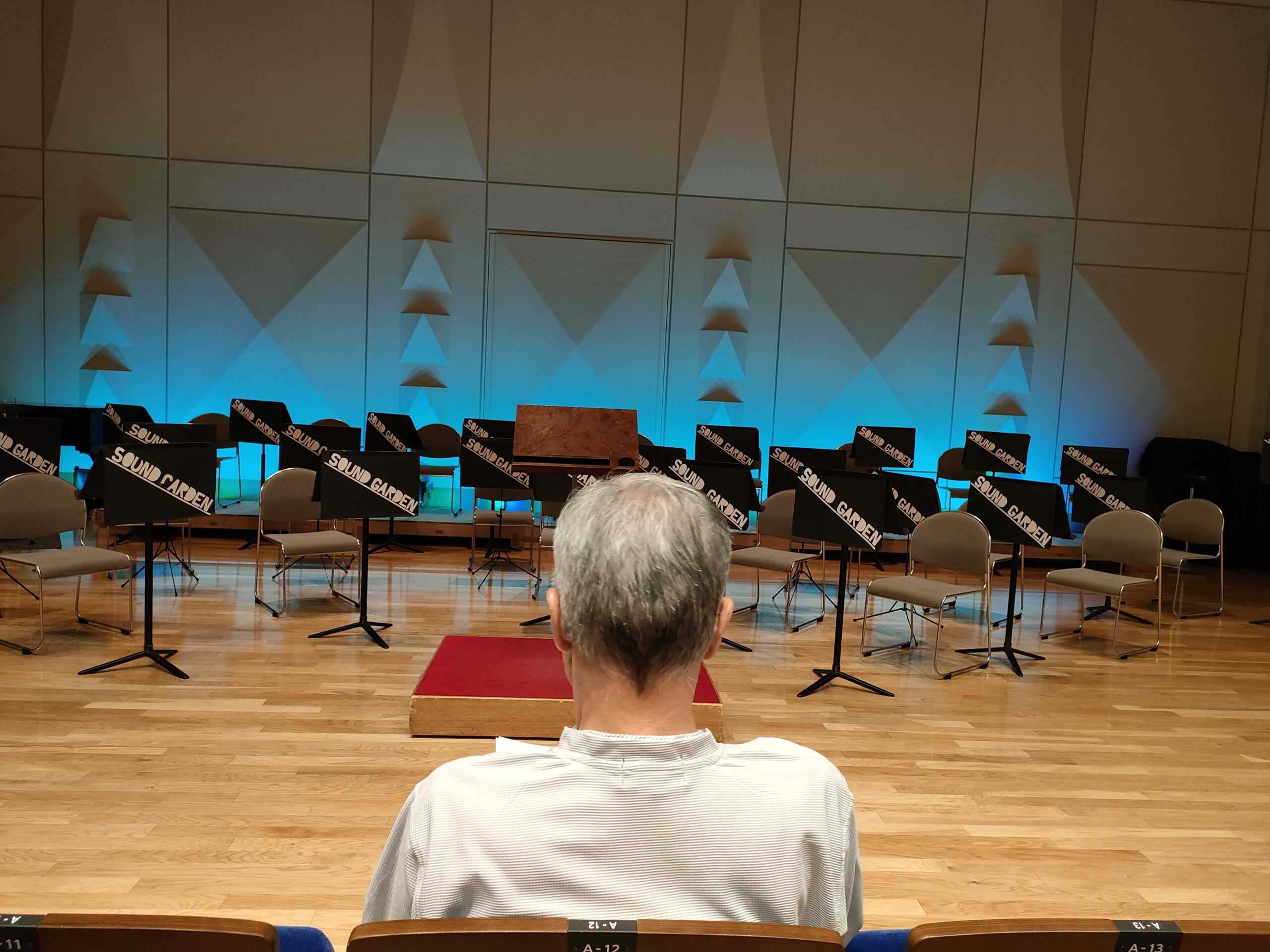 最前列は一人も座ってない。さすがに気が引けて、2列目の中央を陣取ったら。