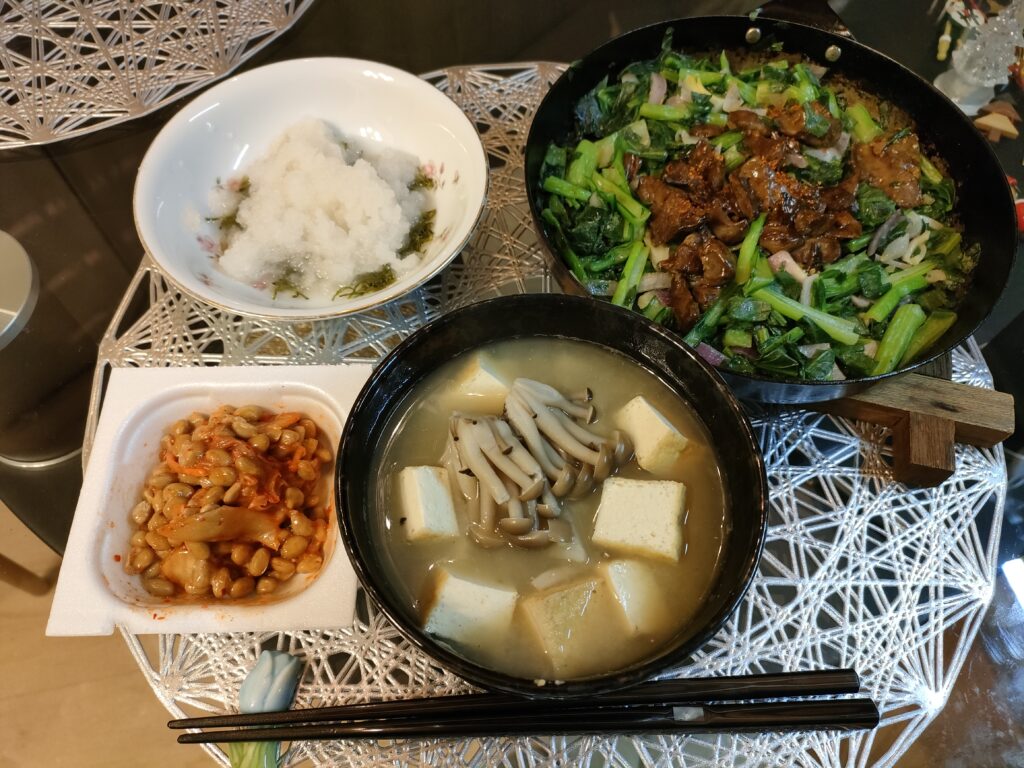 味噌汁は、厚揚げとしめじ。料理本に、しめじを小房に分けずゴロッと入れたら客人がそのおいしさにびっくりした、と書いてあったので真似したら、本当においしいと思った。よかったら、やってみて。