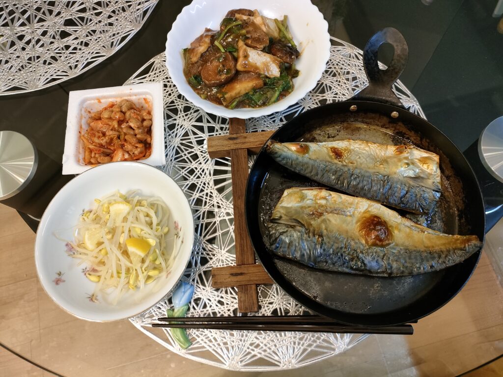 大好物のサバは、いつも2枚同時に焼いて1枚だけ食べる。大根が余ってるし、大根おろしが欲しかったけど副菜を作ったら力尽きた。
