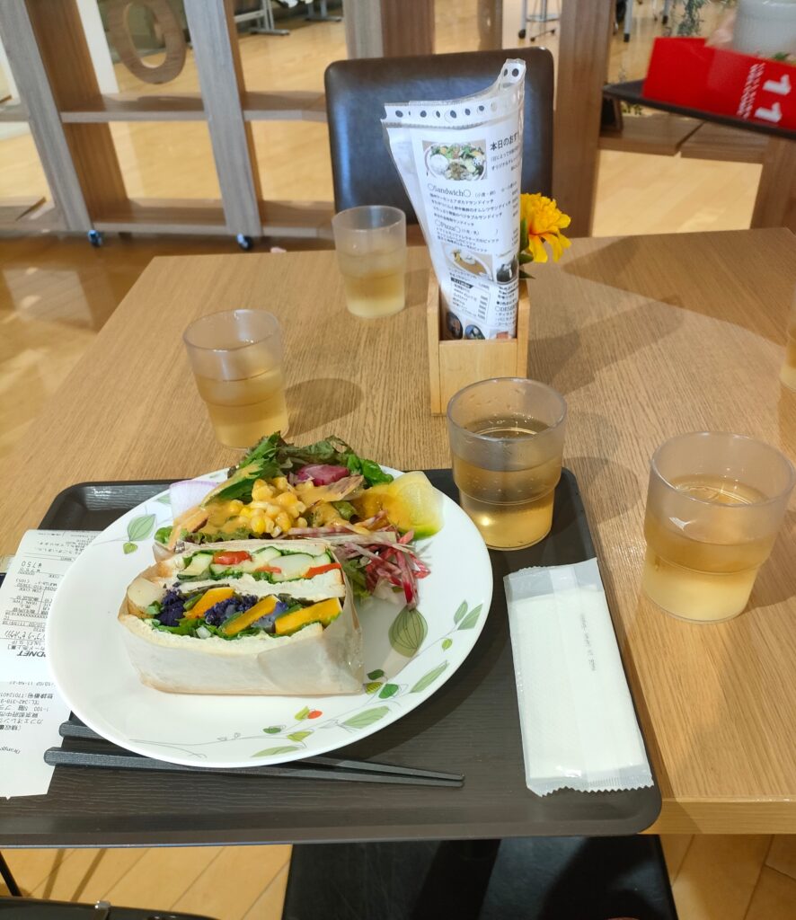 4人のうち最後に注文したあたしがなぜか一番先に受け取れた。ベジタブルサンドイッチ750円に、予想外にたっぷりのサラダが付いてうれしい。