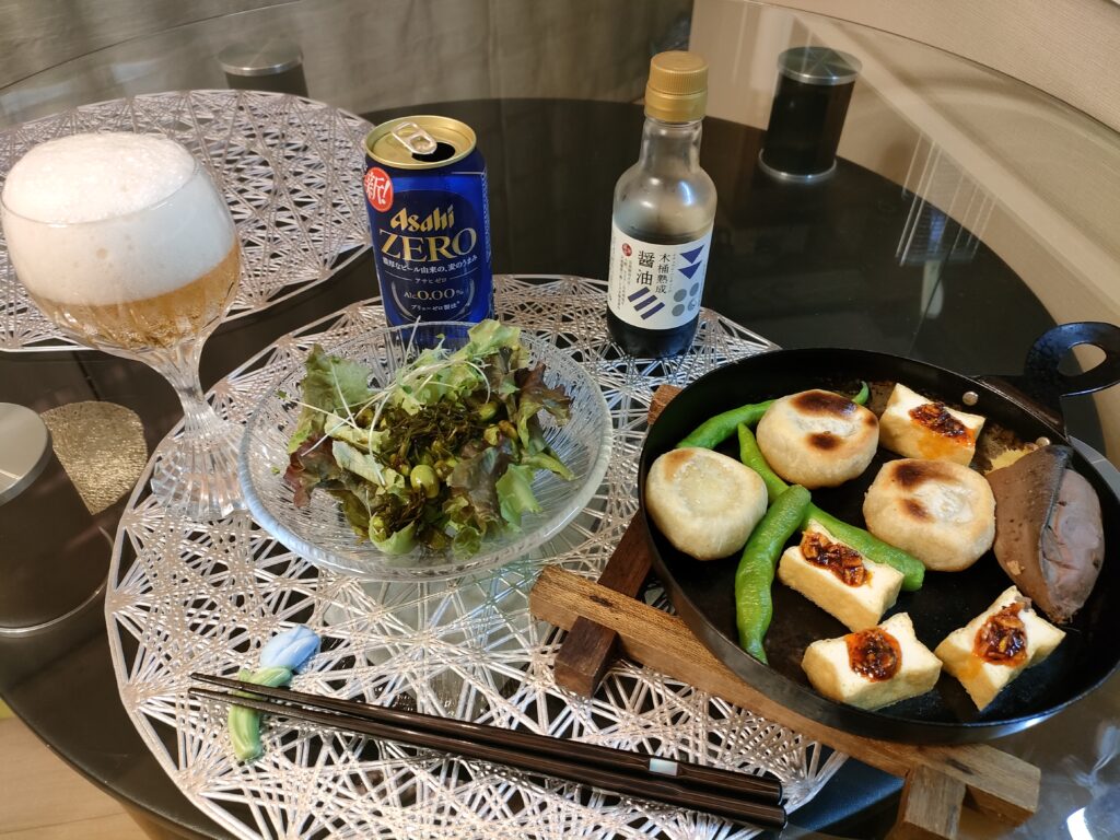 夜はチェンバロレッスンにも行ったので、業スー焼き小籠包を解凍しておいたのよ。一緒に厚揚げと甘長とうがらしと焼芋まで焼いて。
