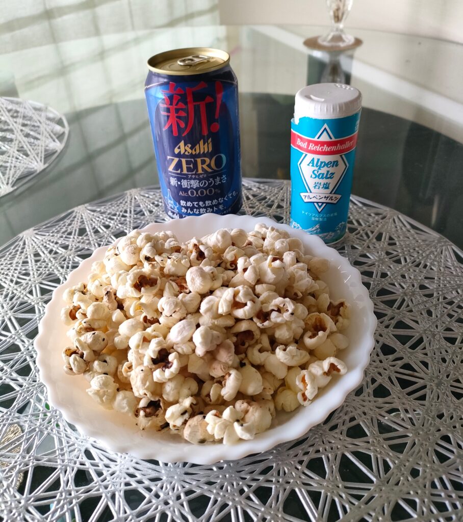 寒いのにビール(ノンアル)など久しぶりに出してみたけどやっぱり飲めず、ひたすらポップコーンが止まらず、完食したよ。