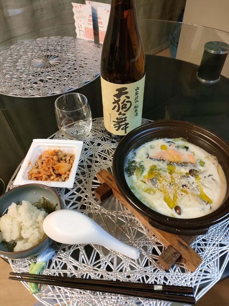 夕飯は、鮭とレタスの豆乳鍋。最後にオリーブオイルを回しかける、というレシピに従った。ここにもシメジが入ってるよ。