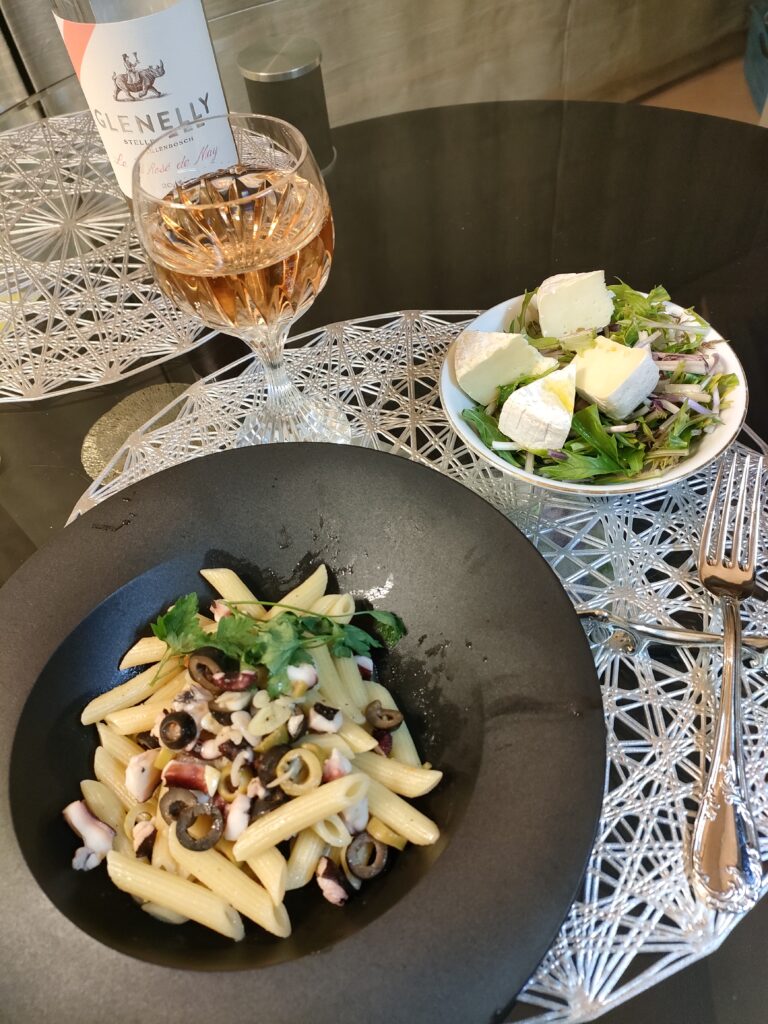 オリーブの黒と緑を両方混ぜて、赤唐辛子もいれてペンネと和えたよ。