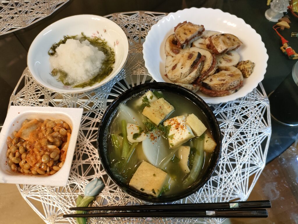 れんこんの、コンビーフはさみ焼き。そのメインよりも味噌汁のほうが大きな顔をしている。