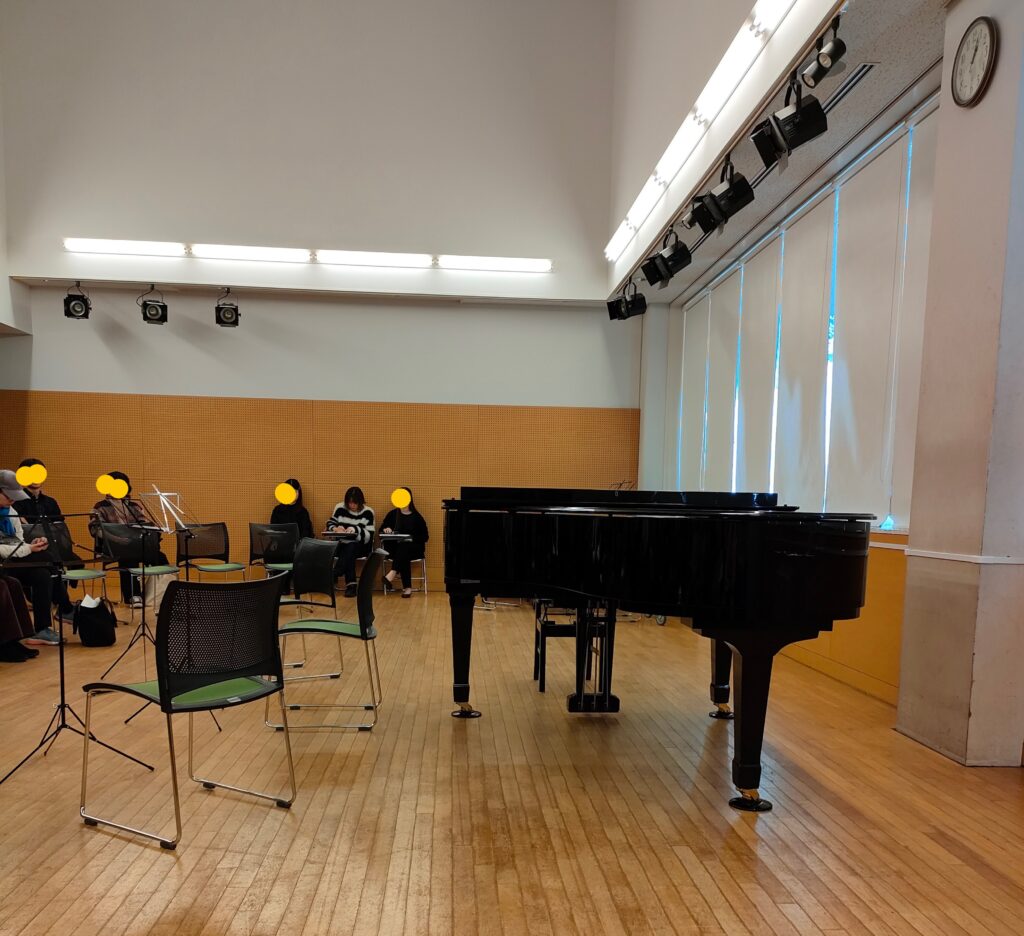 しばらく外を見てみるか、と部屋を出たらすぐ向かいの「舞台芸術実習室」でも室内楽とピアノの会ってのをやってる。