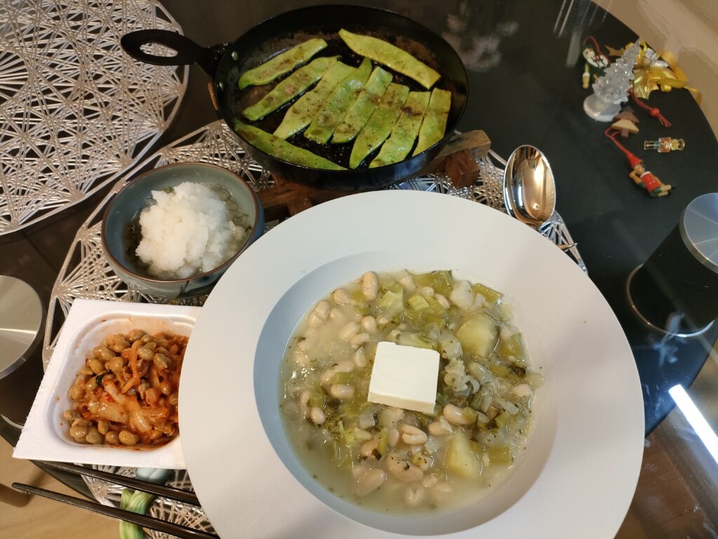そしたら、大根の葉っぱが見事でね。味噌汁なんかに入れるぐらいじゃ使い切れない。で、「リボッリータ」にした。宅配野菜には立派なキャベツも入ってて、この外葉もこのスープに使えるのに、入れるの忘れたー(;_;)