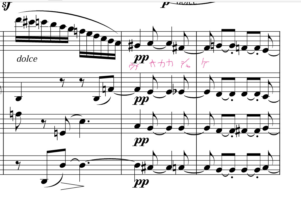 セカンドバイオリンとチェロは「ウメ」が前の小節から連続してるんだよね。