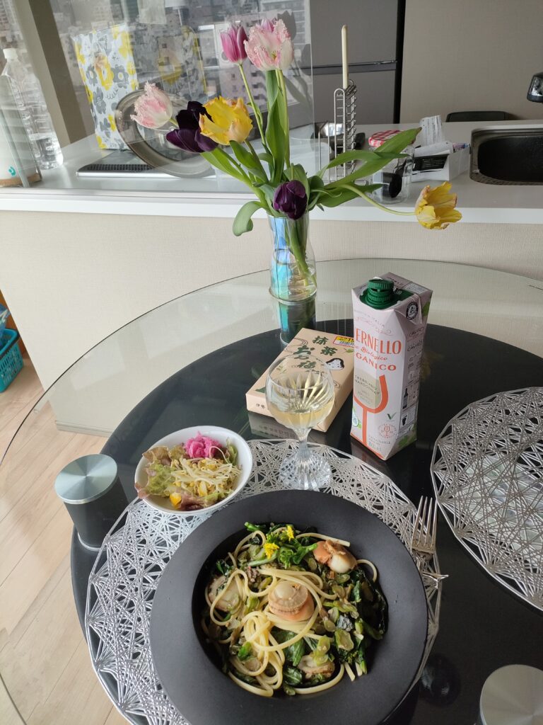 第1食だから朝ご飯て書いたけど、12時。菜の花が届いたので帆立のパスタにした。せっかくだからワインも飲んじゃった。この晩風呂に入るから、夜に飲めないんだもん。