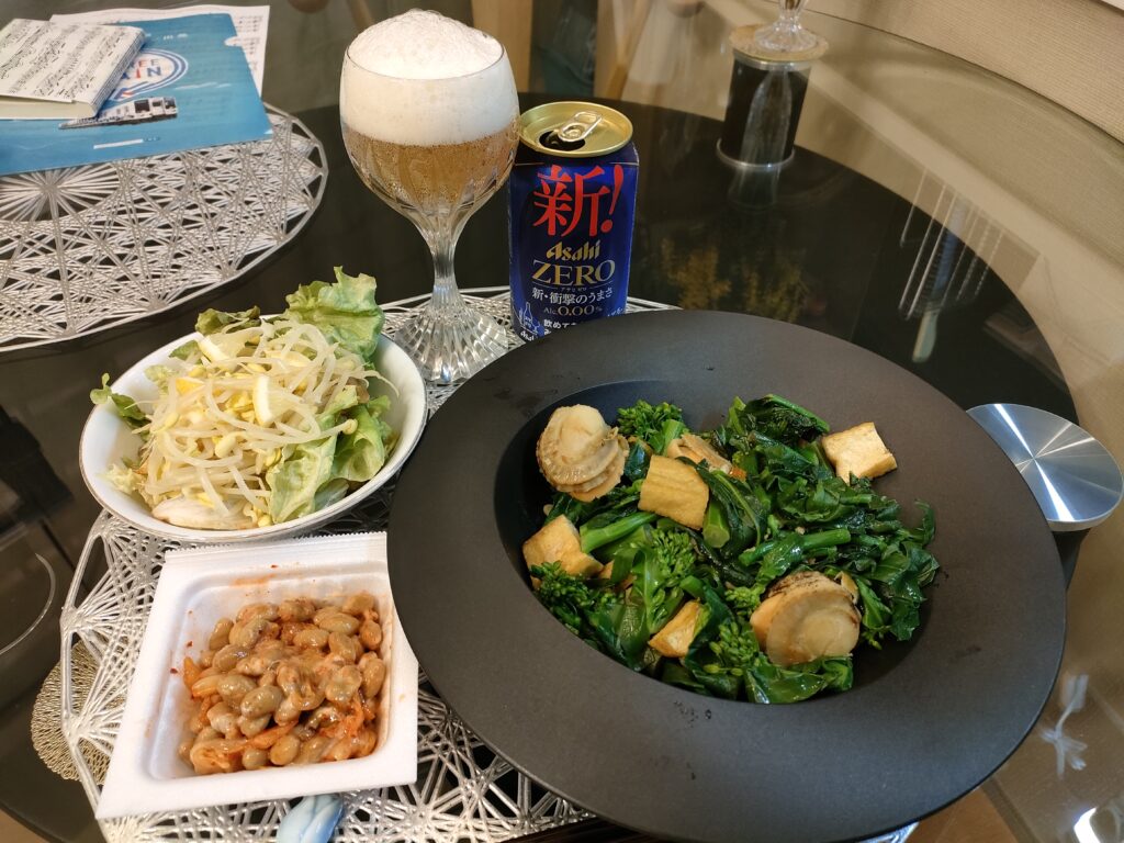 炒め物は、のらぼう菜とホタテと厚揚げ、にんにくと塩コショウをオリーブ油で。