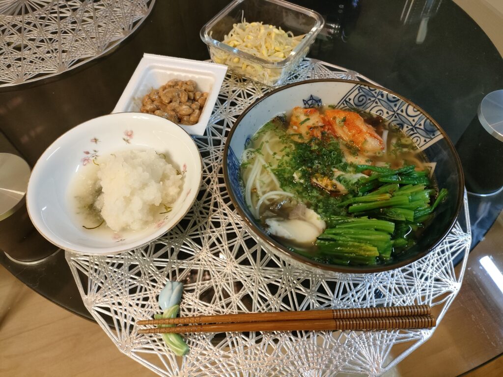 2日前に焼いたサバを使って、うどんにしたよ。きのう届いたほうれん草を茹でて、キムチとねぎを乗せてラー油を掛けた。