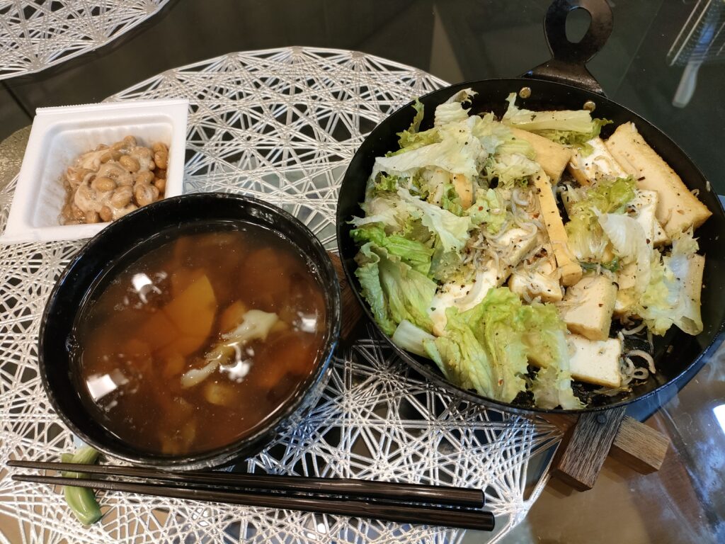 レタスとしらすのガーリックオイル焼き。元レシピは鶏胸肉で、厚揚げに置き換えた。