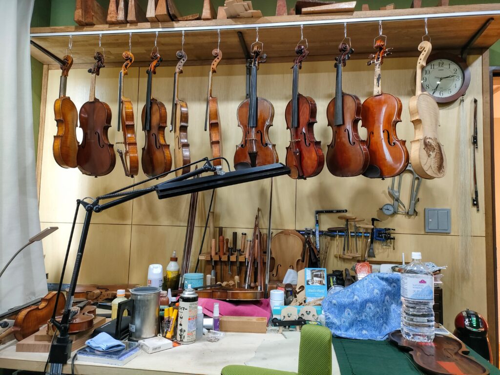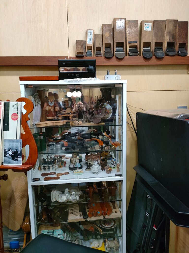 ティーテーブルの隣がこんなことになってる。右端の、イラスト付きのバイオリンはオブジェとして作ったそうだ。猫を飼っていたN井さんが、オーナーを見つめて猫について質問してたわ。