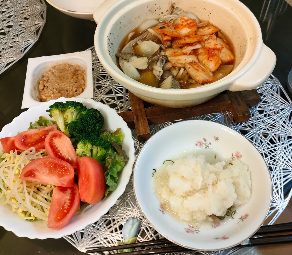 前夜のピェンロー鍋の残り汁にいろいろ入れて、キムチ鍋にしたよ。見えないけど鱈の切り身が入ってる。