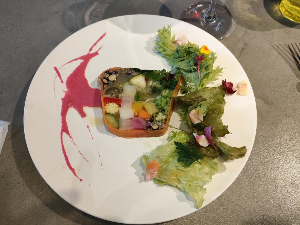 敷いてあるのは、ツルムラサキだったかな?と、落花生のクリームが添えてある。