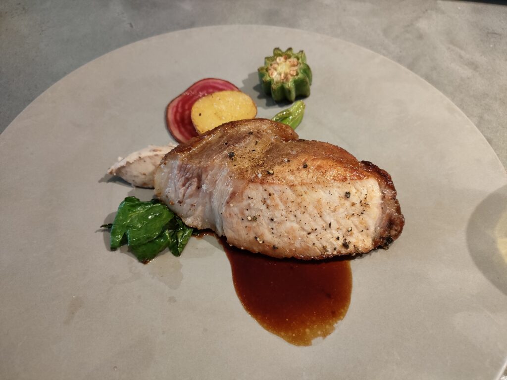 小さく見えるかな?こんな大きいお肉は初めてだ!そして、たぶん63年近く生きてきた中で最高に美味しいと思う一皿で、感激したよ。豚肉のロースト。