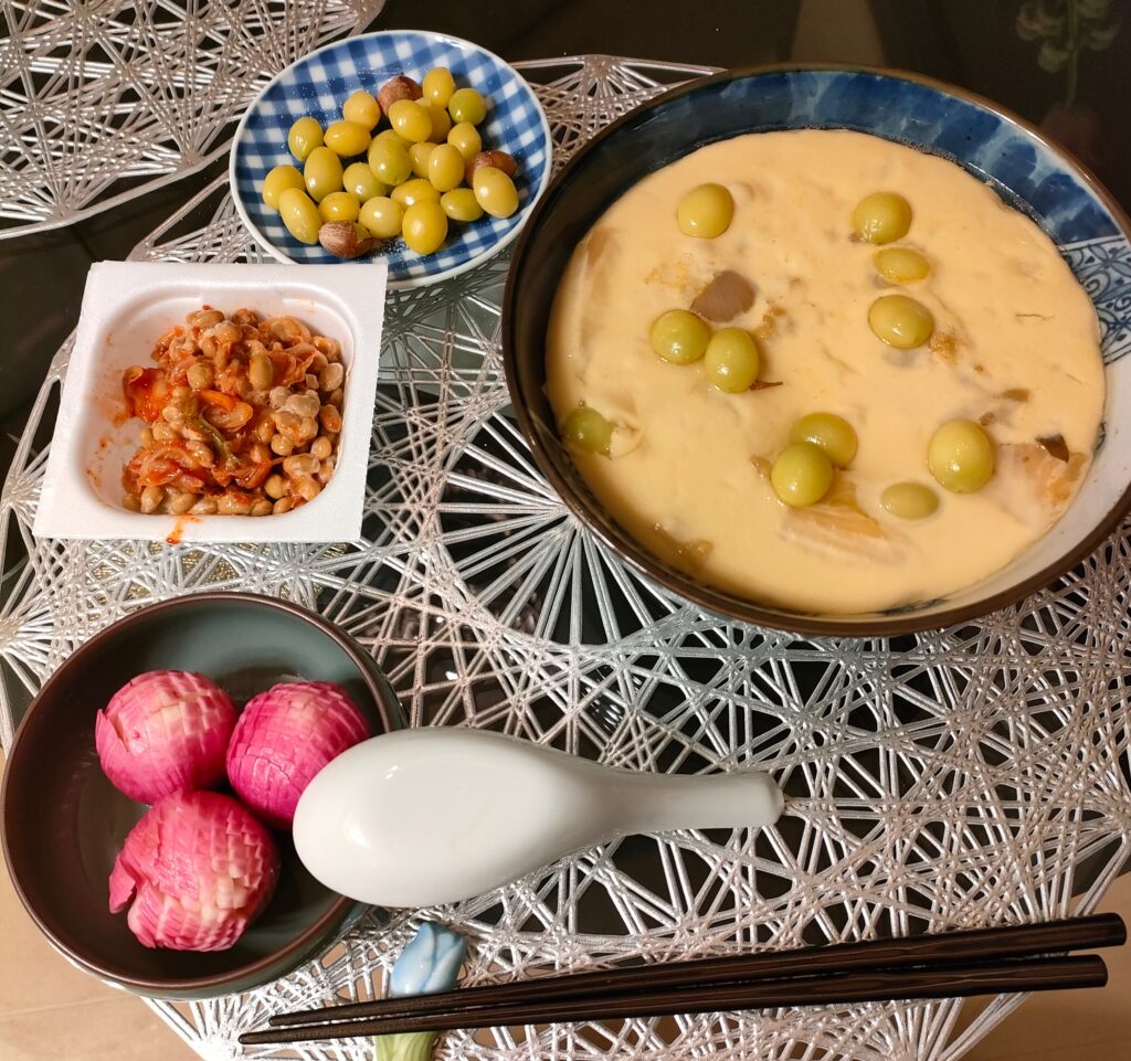 茶碗蒸しの具らしいのはぎんなんだけ。シイタケも鶏肉もカマボコも三つ葉もない。前日の、厚揚げと白菜のトマトジュース煮が余ったのを全部突っ込んだ!少し赤っぽいのは、そういうわけ。