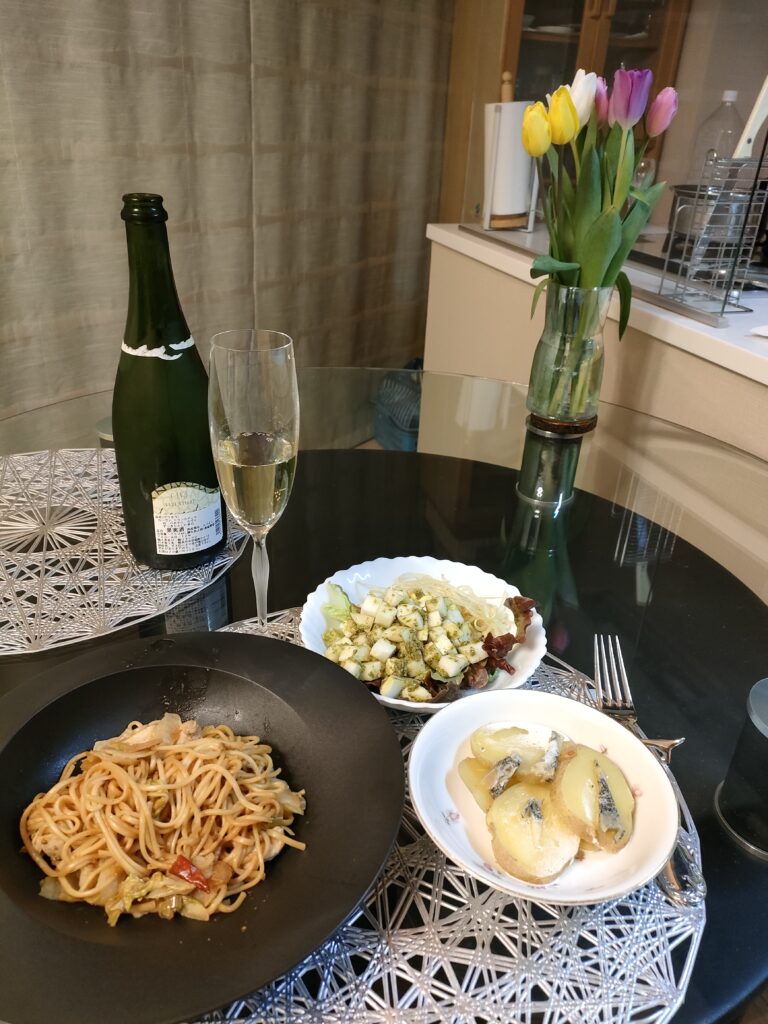 ワインもスパークリングが残り少なかったので、お代わりの白ワインを2杯ほど。でも全然眠くならず、勉強できたよん。