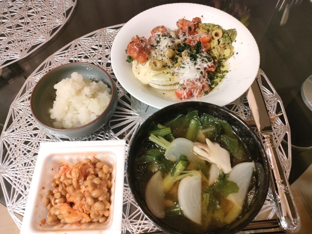 昼ごはんに、小松菜としらすのパスタ。醤油味に見えるかも。違うの。塩とオリーブオイルだけ。茶色いのは、シラスを焦がしてしまったのだ。平めんと紛らわしいけど、グラナパダーノチーズを削ってかけた。