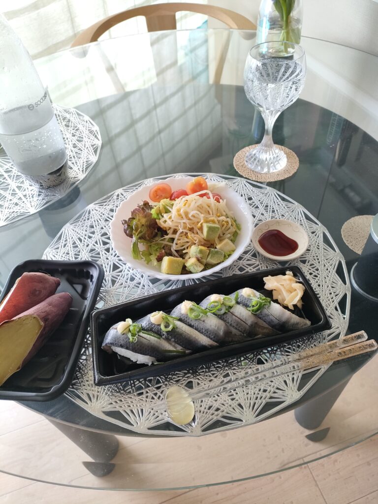 とにかく時間がないので、中食。イワシの握り、スーパーに行くたび毎回買いたいの我慢してるんだ。こういうときこそ。これだけじゃ夜まで持つわけない、焼芋も半分。