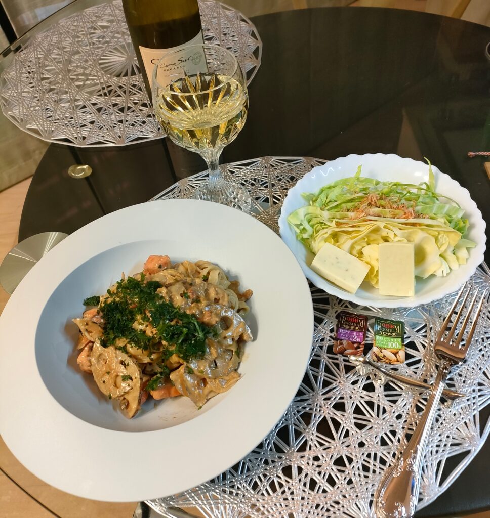 ゆでたれんこんが残ってて、パスタにしたよ。パセリ大好きだからかけすぎて、パスタだかなんだか見えやしない。あと玉ねぎをちょっぴりと、鮭の切り身も崩して入れた。