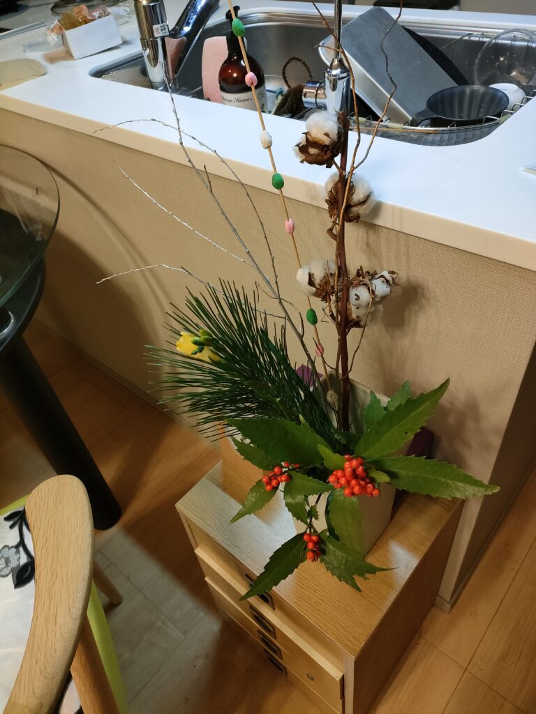 束は小さいけど、何年か使い回してる飾り物の丈が長いから、食卓の上に飾れない。写真に撮ると、生活感があふれすぎるねえ。